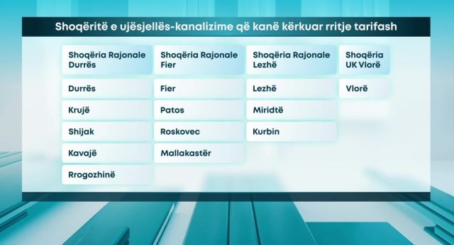Më konkretisht, aplikimi i Durrësit përfshin edhe Krujën, Shijakun, Kavajën dhe Rrogozhinën, tek kërkesa e Fierit bën pjesë edhe Patosi, Roskoveci dhe Mallakastra, ndërsa për Lezhën, përfshihet edhe Mirdita e Kurbini. Ndërkaq, paralelisht me këto shoqëri rajonale ka aplikuar edhe shoqëria e ujësjellës –kanalizime Vlorë, që aktualisht operon si e vetme, duke e çuar në 13 numrin e qyteteve për të cilët kërkohet rritje e çmimit të ujit.