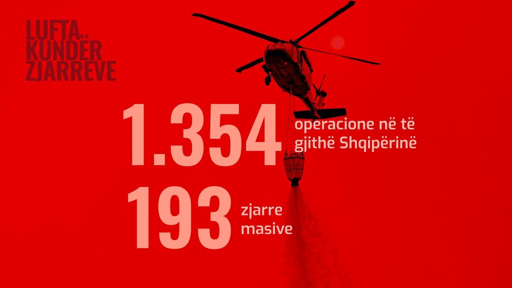 Në të gjithë gjithë vendin gjatë kësaj vere janë kryer 1354 operacione për shuarjen e 193 zjarreve masive. Agjencia për Media dhe Informim bëri të ditur sot disa të dhëna lidhur me angazhimet në terren nga ajri dhe toka të forcave operacionale në javët e vështira të luftës ndaj zjarreve.
