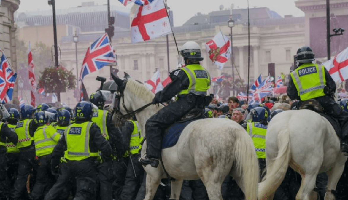 Policia Metropolitane tha se tensionet shpërthyen gjatë tubimit Unite the Kingdom, me disa protestues që hodhën shishe dhe objekte të tjera ndaj policisë, duke lënë katër oficerë të plagosur rëndë.