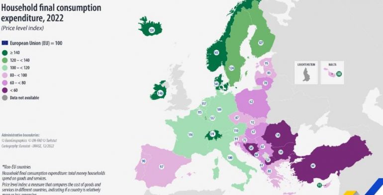 Në vitin 2022, nivelet e çmimeve për shpenzimet e konsumit përfundimtar të familjeve, ndryshonin gjerësisht në të gjithë BE-në. Nivelet më të larta të çmimeve u regjistruan në Irlandë (146% e mesatares së BE-së), Danimarkë (145%) dhe Luksemburg (137%). Nivelet më të ulëta janë shënuar në Rumani (58%), Bullgari (59%) dhe Poloni (62%).