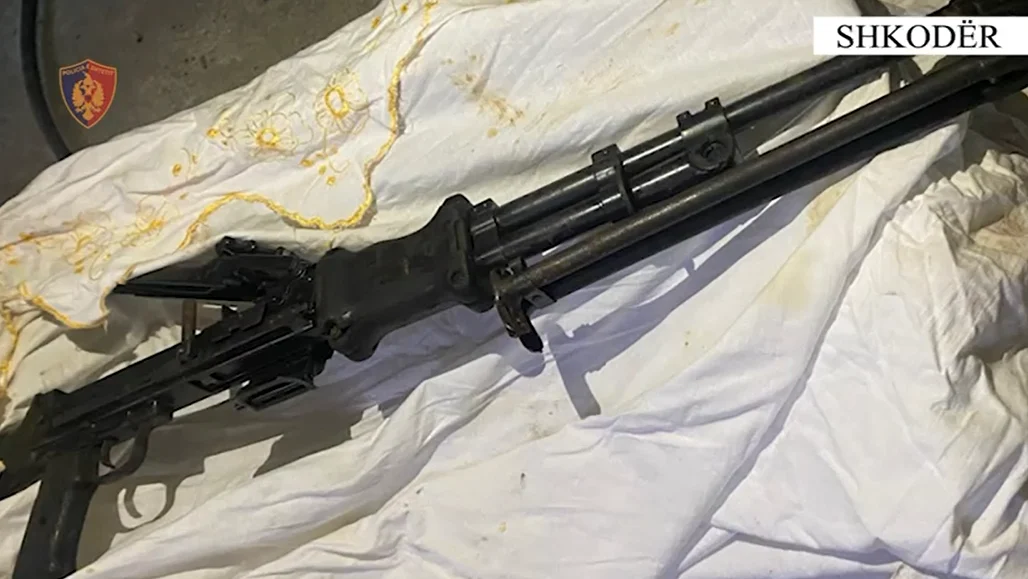 Gjenden në banesën e 19-vjeçarit dhe sekuestrohen, në cilësinë e provës materiale, një armë zjarri mitraloz i lehtë, municion luftarak, një sasi lënde narkotike kanabis dhe veshjet e përdorura gjatë vendosjes së zjarrit.