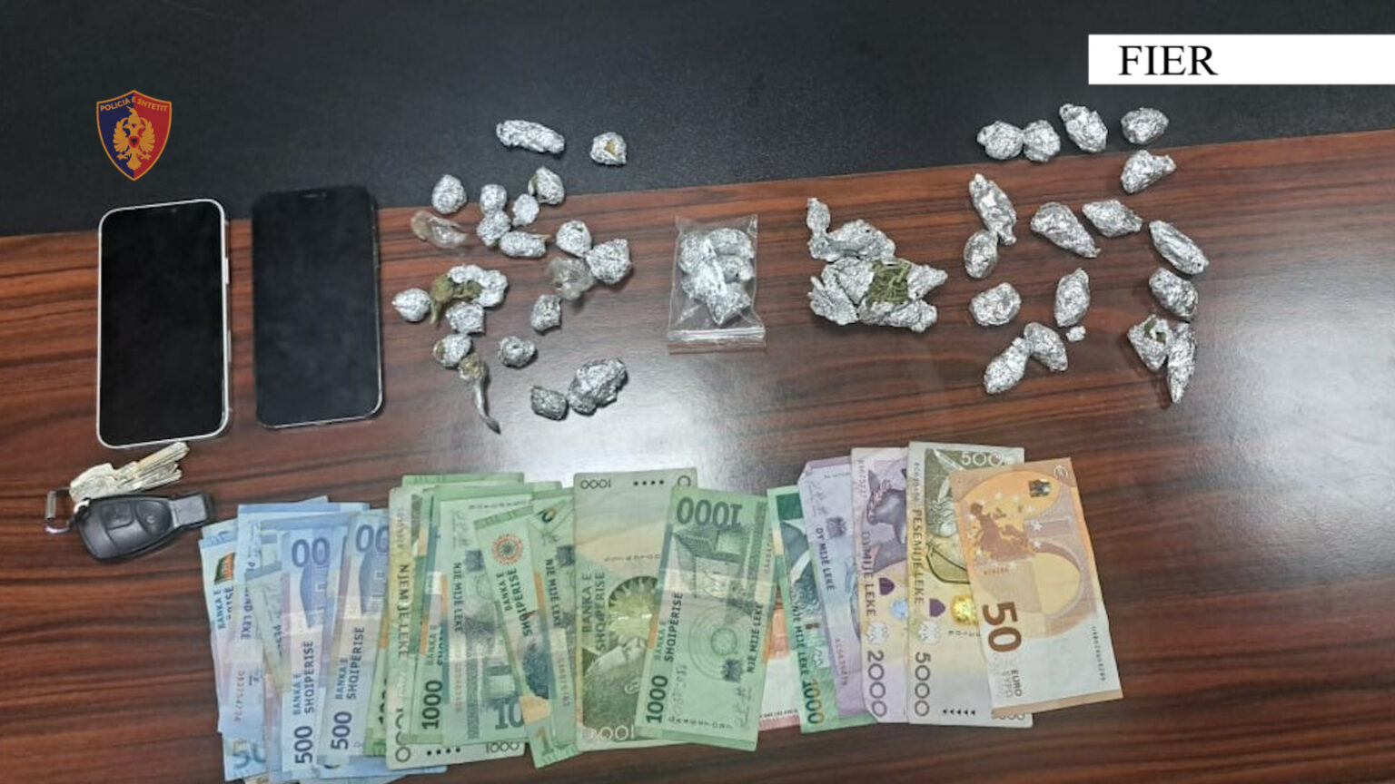 I arrestuari është shtetasi M. B., 25 vjeç, banues në Fier. Gjatë kontrollit fizik dhe të banesës së tij, policia i sekuestroi: 45 doza Cannabisi të gatshme për shitje, 1 automjet dhe 1 motomjet, që dyshohet se përdoreshin për shpërndarjen e drogës, 2 celularë, që po analizohen për të zbuluar kontaktet e mundshme me rrjetin e klientëve si dhe shuma parash të dyshuara të përfituara nga veprimtaria kriminale.