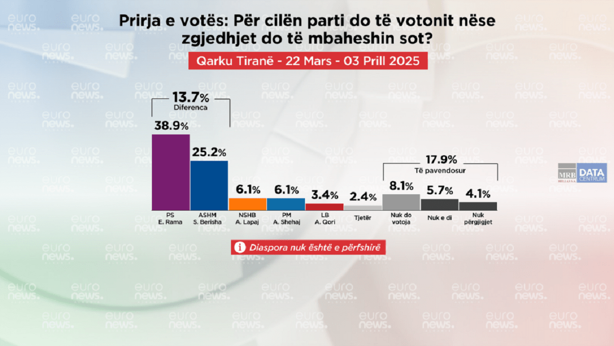 38.9% do të votonin Partinë Socialiste, 25.2% do të votonin Aleancën Shqipëria Madhështore (PD)