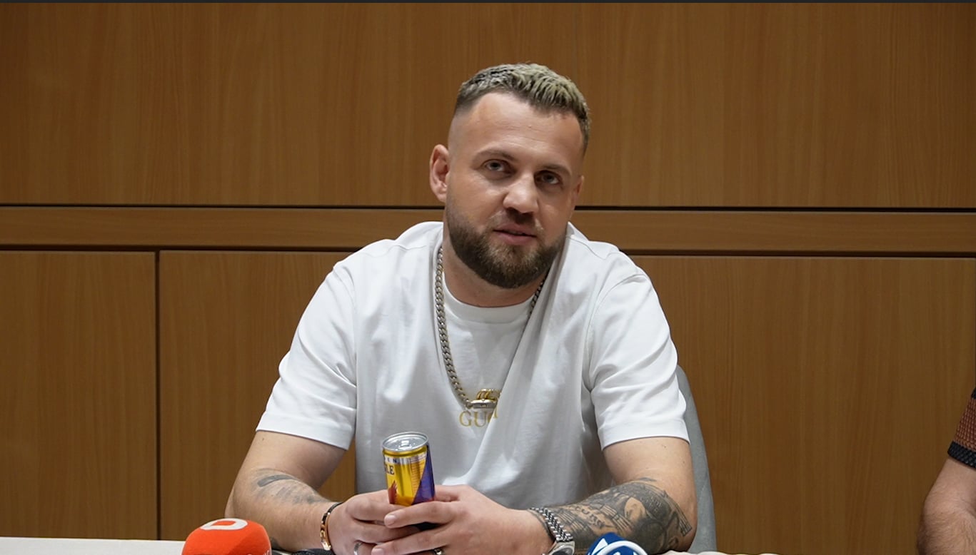 Këngëtari Luizi Ejlli në një konferencë për shtyp, ku njoftoi se do të jetë imazhi i ri i pijes energjike Golden Eagle, foli ndër të tjera edhe për ndjesitë e të qenit baba tashmë i vajzës Luna Mari.