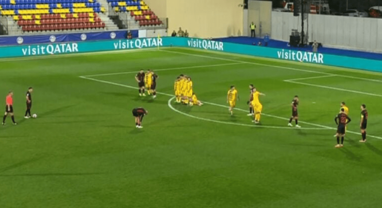 Në minutat e fundit të pjesës së parë, gjatë një goditjeje këndi për Shqipërinë, topi i goditur nga Berat Gjimshiti përplaset mbi traversë, duke shpëtuar portën vendase.