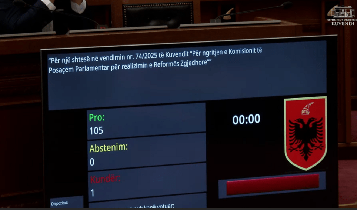 Kuvendi në fundin e seancës së sotme plenare ka miratuar ngritjen e dy komisioneve të posaçme parlamentare bipartizane që kanë të bëjnë me Reformën Zgjedhore dhe tjetra me atë Territoriale.