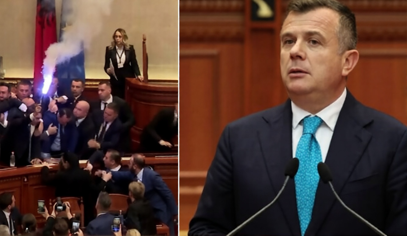 Në një moment, deputeti Belind Këlliçi ndezi edhe flakadanë, ndërsa deputetë të tjerë hodhën edhe shishe me ujë në drejtim të kreut të Kuvendit Niko Peleshi.