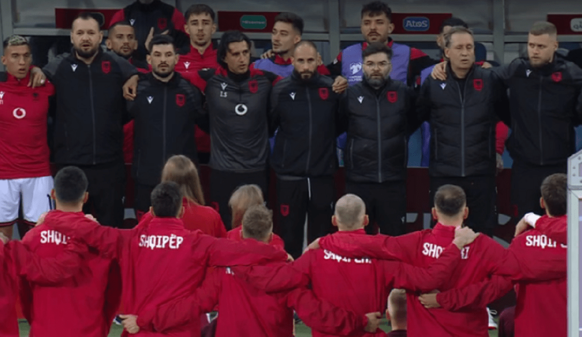 Atmosfera është e ndezur në stadium dhe mbështetja e tifozëve kuqezi nuk mungon. Pas himnit erdhën edhe thirrjet e tifozëve shqiptarë për Kombëtaren.