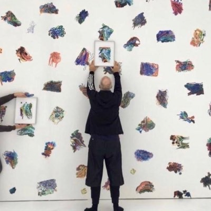 Kryeministri shihet teksa vendos në mur një nga pikturat e tij.