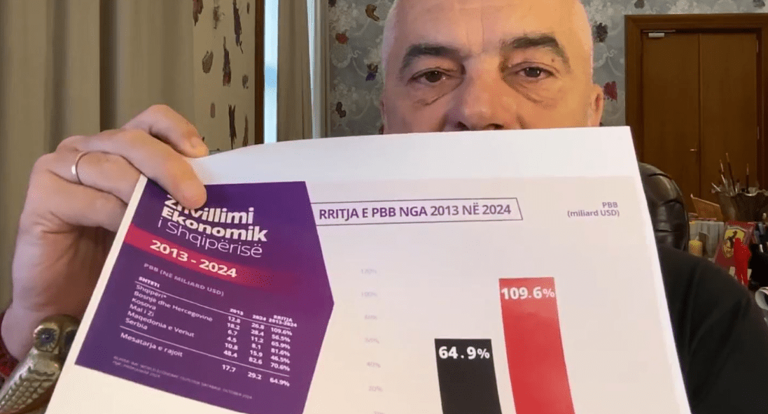 Këtu është rritja e PPB nga viti kur ne morëm detyrën, në krahun e djathtë timin, shikoni kolonat me të kuqe, është 109.6% rritja e PBB e Shqipërisë, 64.9% rritja e prodhimit mesatar e rajonit dhe pot ë shikoni këtu, vendet e rajonit e kanë më të vogël se ne, sepse Shqipëria në këto tre mandatet tona, ka bërë një kapërcim epokal, duan disa apo nuk duan disa”, tha ai.
