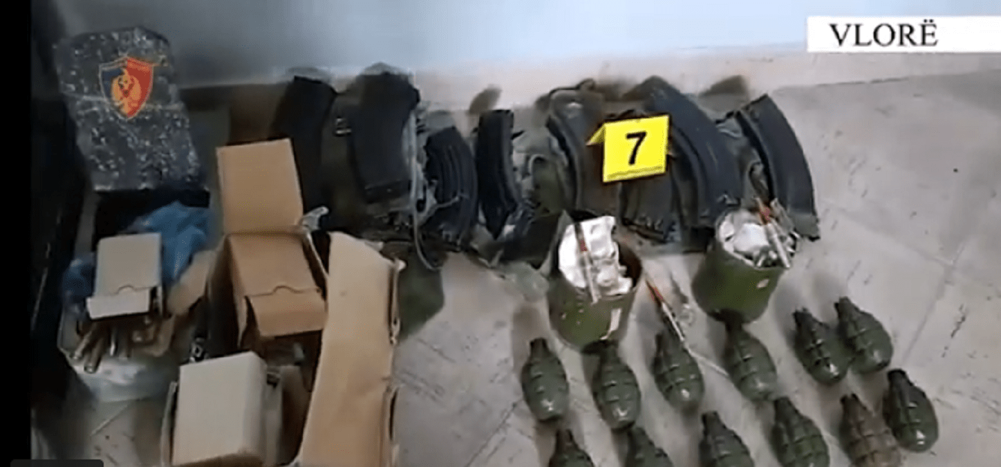 Në murin e një ndërtese në Vlorë, uniformat blu gjetën dhe sekuestruan 2 armë zjarri automatike, mbi 2200 fishekë luftarak dhe 12 granata difensive.