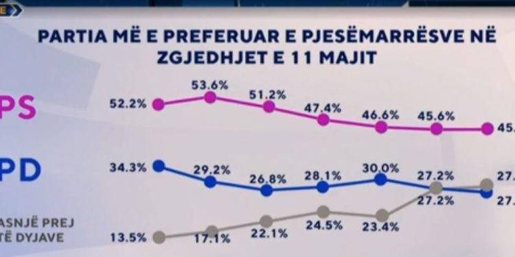 Nga 11 maji, PS ka rënë me 7%, duke rënë poshtë 50%, në 45%. Kurse PD, po ashtu ka rënie me 7%.