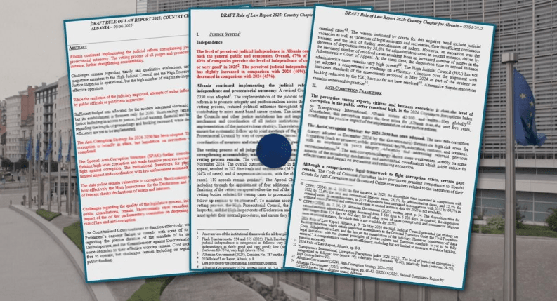 Komisioni Europian ka hartuar një draft raport për sundimin e ligjit, ku analizohet ecuria e reformës në drejtësisë, përfshi sfidat me luftën ndaj korrupsionit. Draft raporti i është dërguar institucioneve shqiptare për t’ju përgjigjur me komente, të cilat reflektohen më pas në raportin final. Ky draft raport për sundimin e ligjit në vend, fillimisht tregon si qytetarët e perceptojmë drejtësinë e vendit të tyre sot.