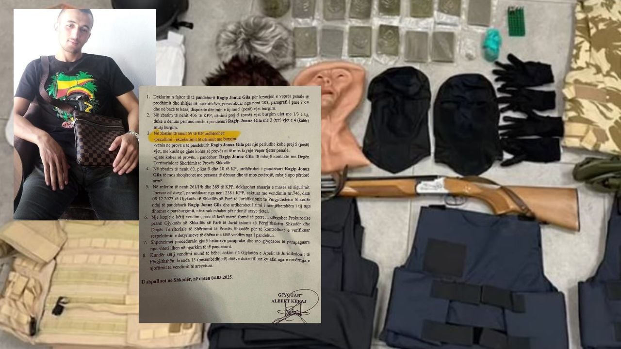 Dy vite më parë atij iu sekuestruan 7 jelekë anti-plumb, 2 palë doreza, 3 maska, 2 paruke, municion luftarak, 1 kokore metalike, 1 armë gjahu dhe sende të tjera të kundërligjshme, si dhe sasi lënde të dyshuar narkotike kanabis.