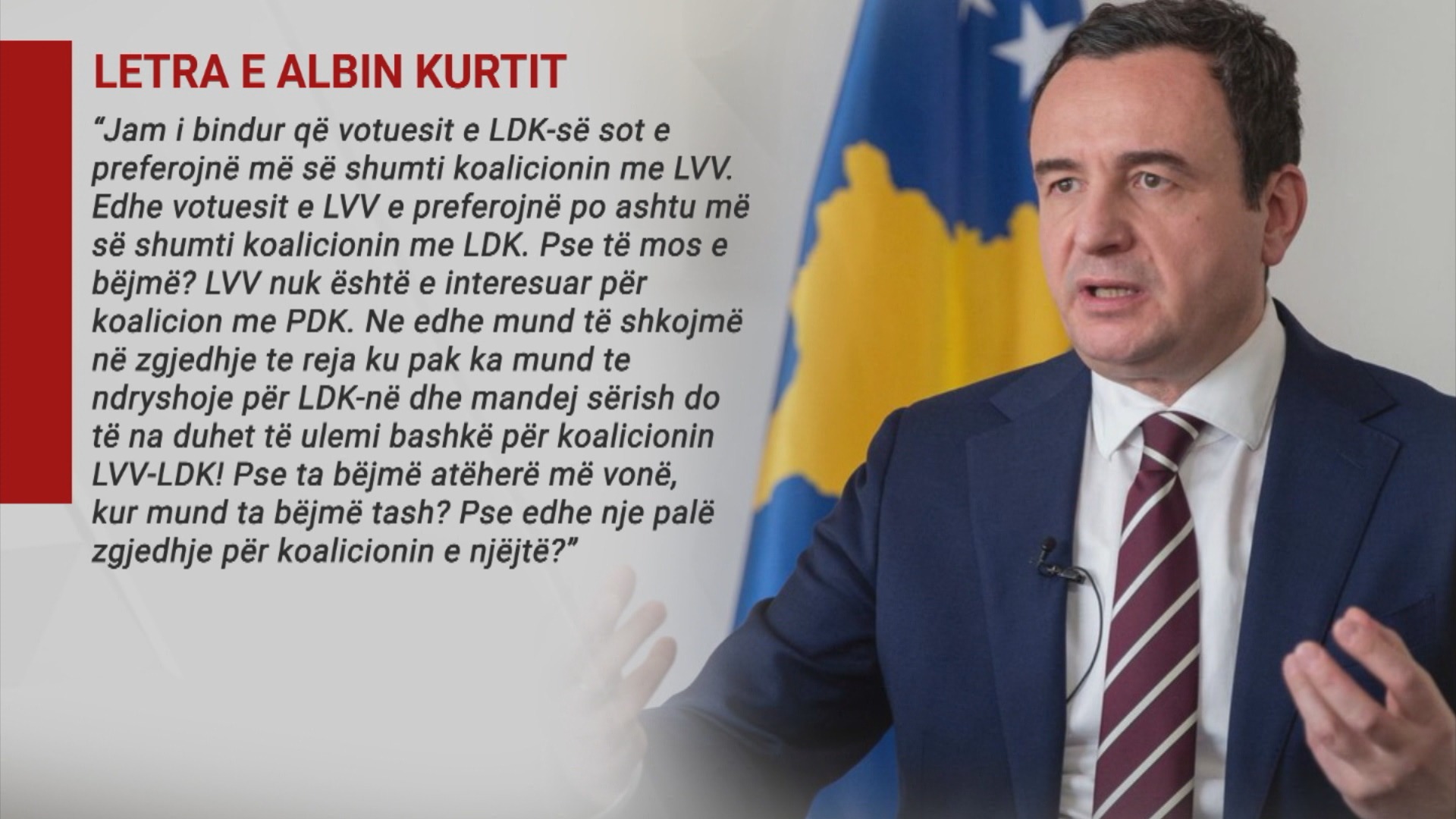 “Jam i bindur që votuesit e LDK-së sot e preferojnë më së shumti koalicionin me LVV. Edhe votuesit e LVV e preferojnë po ashtu më së shumti koalicionin me LDK. Pse të mos e bëjmë? LVV nuk është e interesuar për koalicion me PDK. Ne edhe mund të shkojmë në zgjedhje te reja ku pak ka mund te ndryshoje për LDK-në dhe mandej sërish do të na duhet të ulemi bashkë për koalicionin LVV-LDK! Pse ta bëjmë atëherë më vonë, kur mund ta bëjmë tash? Pse edhe një palë zgjedhje për koalicionin e njëjtë?”, thuhet në letrën e Albin Kurtit.